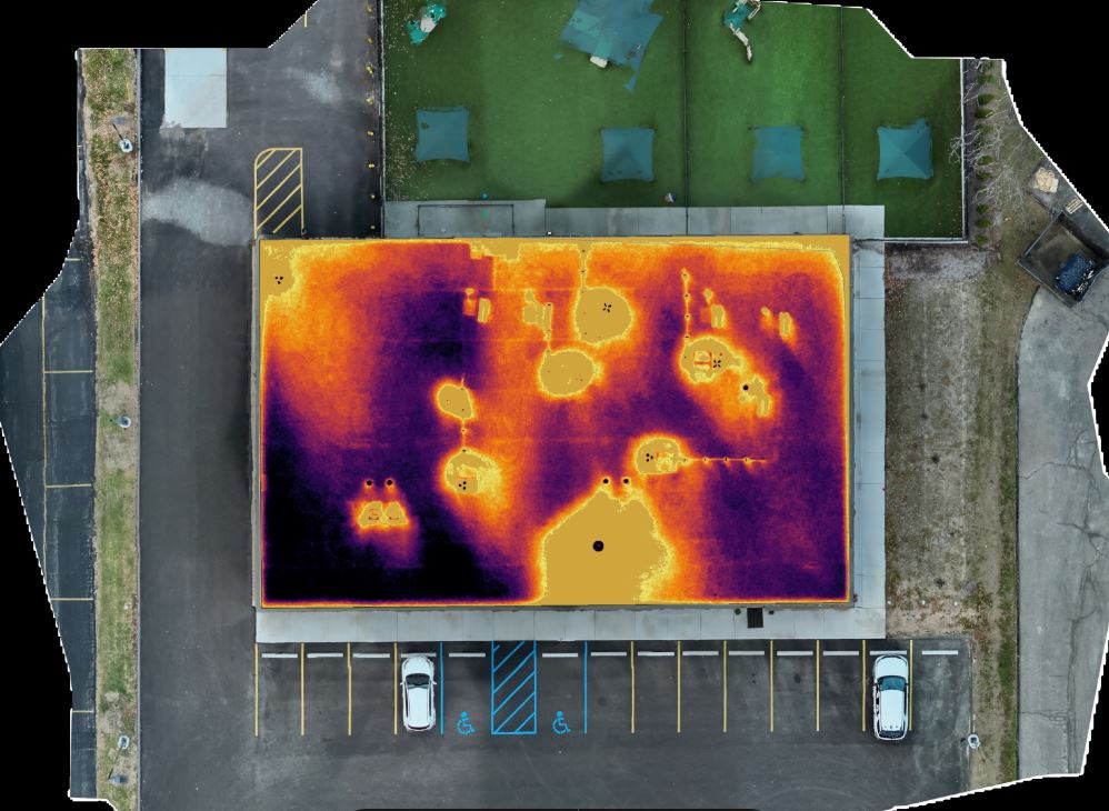 A drone can inspect elevated, expansive, or difficult-to-reach areas without requiring the same level of ladders, lifts, scaffolding, or physical roof access that may otherwise be needed. It can also capture a broader overhead view, helping clients see how isolated anomalies relate to the whole system. On large commercial rooftops, industrial facilities, and campus-style properties, that perspective can make pattern recognition far easier and far more efficient than walking the entire site manually.